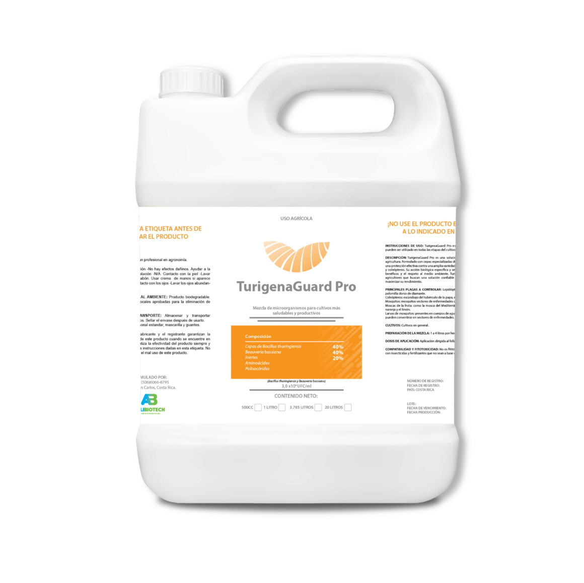 TurigenaGuard Pro es una solución avanzada para el control de plagas en agricultura. Formulado con cepas especializadas de Bacillus thuringiensis, este producto ofrece una protección efectiva contra una amplia variedad de insectos dañinos, incluidos lepidópteros y coleópteros. Su acción biológica específica y selectiva asegura la preservación de insectos benéficos y el respeto al medio ambiente.